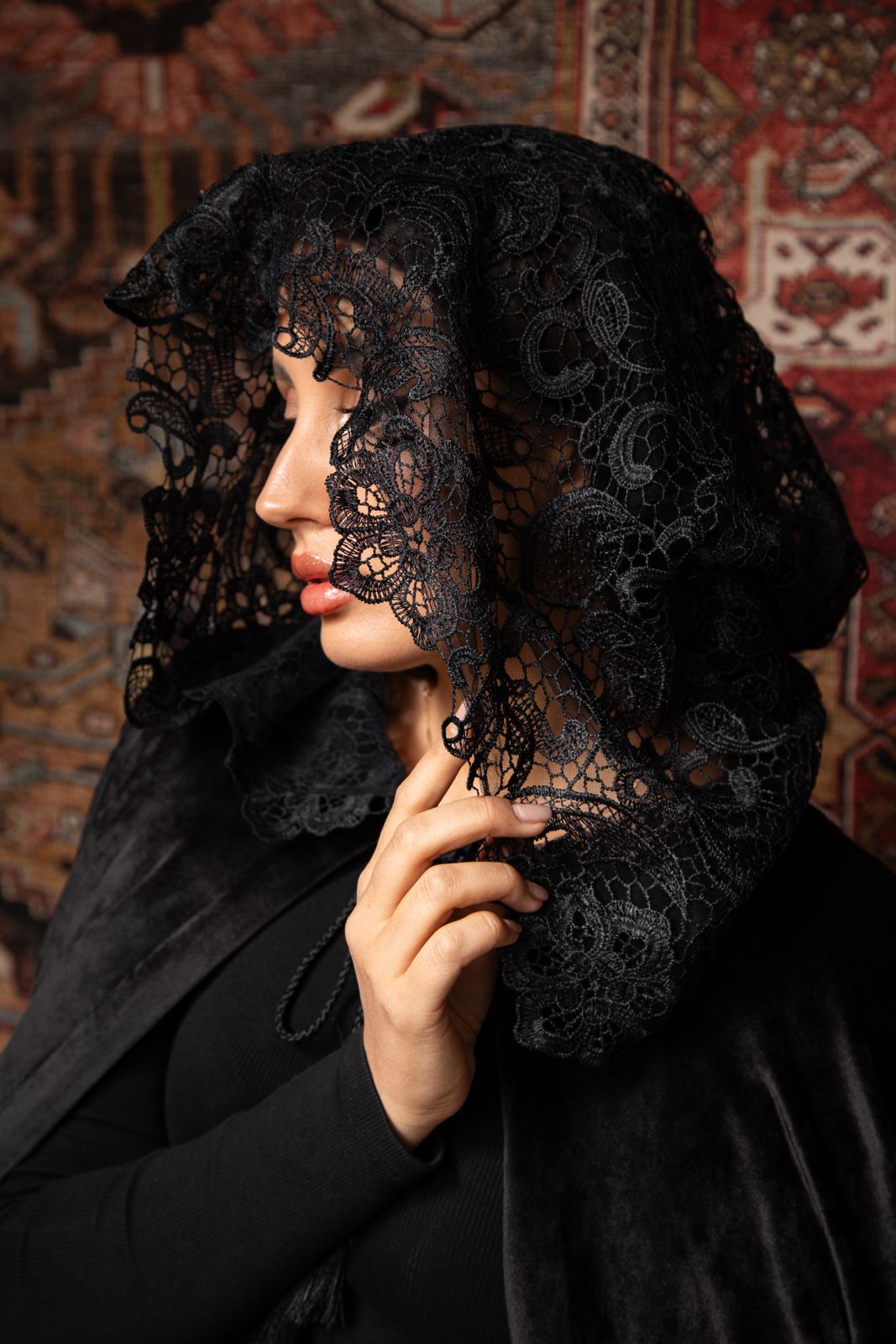 The Nashmira cape wraps the silhouette in timeless elegance and subtle mystery. Crafted from soft, fluid velvet, it features a hood adorned with guipure lace, adding texture, refinement, and character. Its generous, flowing cut layers effortlessly over both elegant and minimalist looks, making it a statement piece perfect for Ramadan evenings and special occasions.
