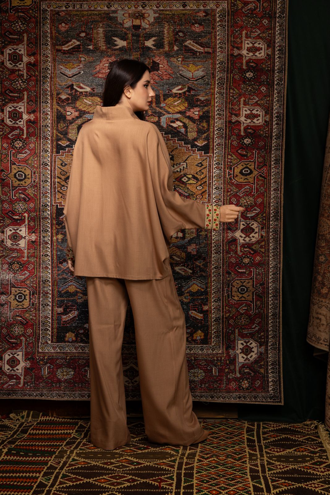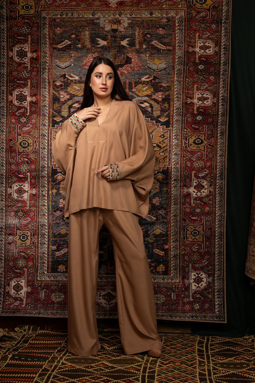 The Sahara set embodies a free and contemporary elegance. It features a fluid tunic with a relaxed fit and matching wide-leg trousers, crafted from lightweight wool for comfort, softness, and a natural drape. The sleeves are enhanced with decorative trims, adding contrast and character to the silhouette. Designed for Ramadan and beyond, this set offers a modern and effortless look.