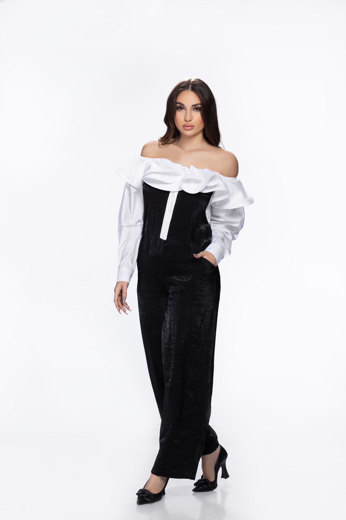 La combinaison Nolana est une création qui allie la légèreté et la commodité du popeline avec le charme aérien du taffetas. Elle est sublimée par des volants délicats qui tombent sur les épaules, apportant une touche d’élégance romantique. Les manches, resserrées aux poignets, mettent en valeur leur volume bouffant, créant ainsi une silhouette envoûtante qui marie fonctionnalité quotidienne et fantaisie délicate.