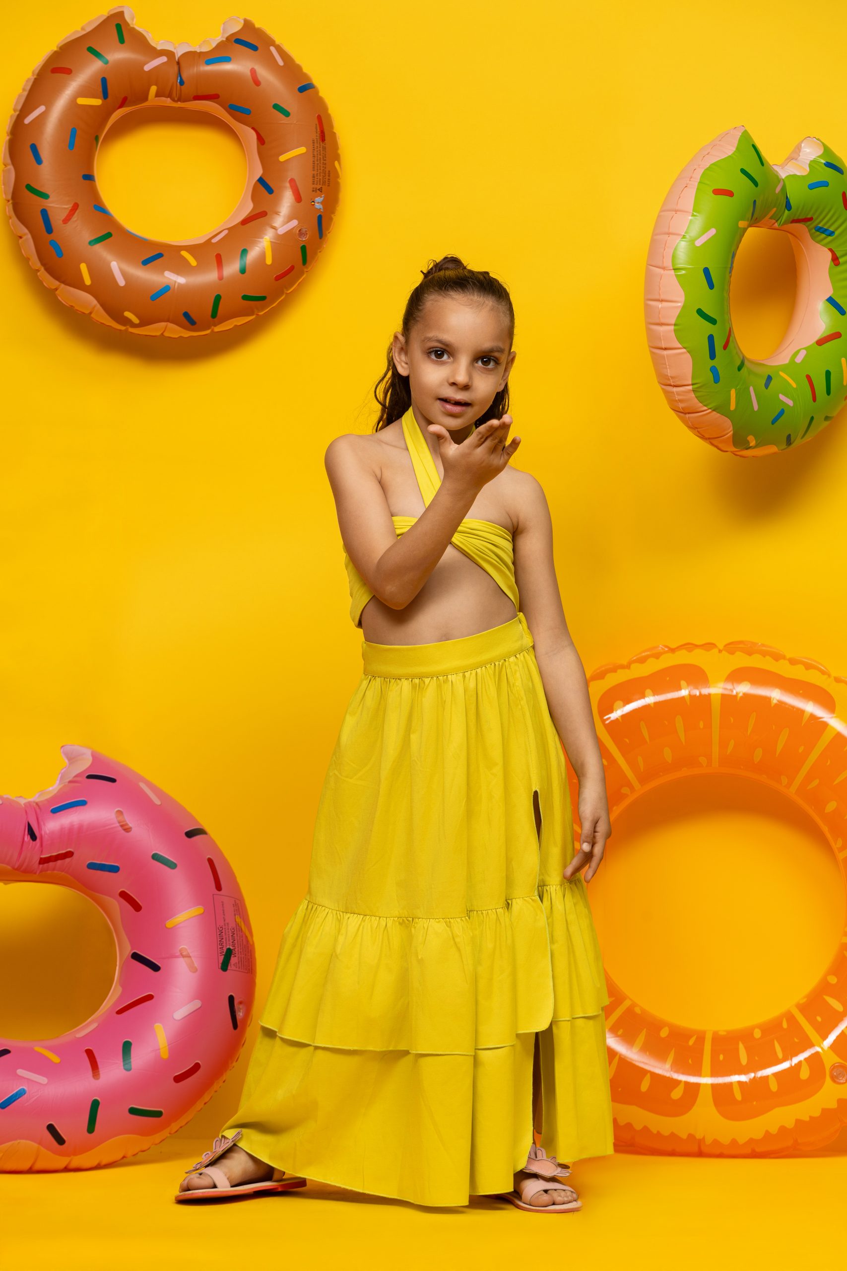 Composé d’un top croisé avec dos smocké pour un maintien confortable et un enfilage facile, et d’une jupe fluide à volants avec fente subtile, ce modèle dessine une silhouette moderne et sans effort. Léger et agréable à porter, il accompagne parfaitement les journées ensoleillées, entre plage, vacances et moments complices avec maman.